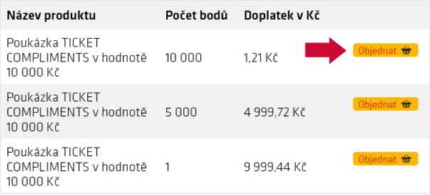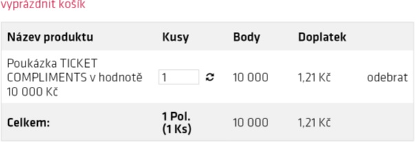 Na detailu odměny vyberete jednu ze tří možných variant čerpání bodů a doplatku v Kč a kliknete na tlačítko „Objednat“, čímž dojde k jejímu vložení do Košíku: