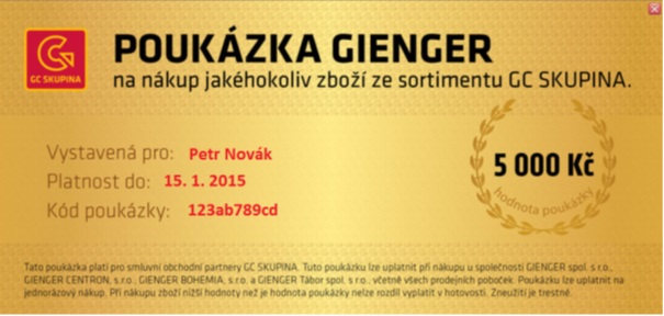 Jednou z odměn je tzv. GC POUKÁZKA. Tuto poukázku můžete uplatnit na slevu při nákupu zboží na všech prodejních místech GC SKUPINY. Poukázka platí na nákup jakéhokoliv zboží z prodejního sortimentu a lze ji uplatnit na jednorázový nákup. Při nákupu zboží nižší hodnoty než je hodnota poukázky nelze rozdíl vyplatit v hotovosti.